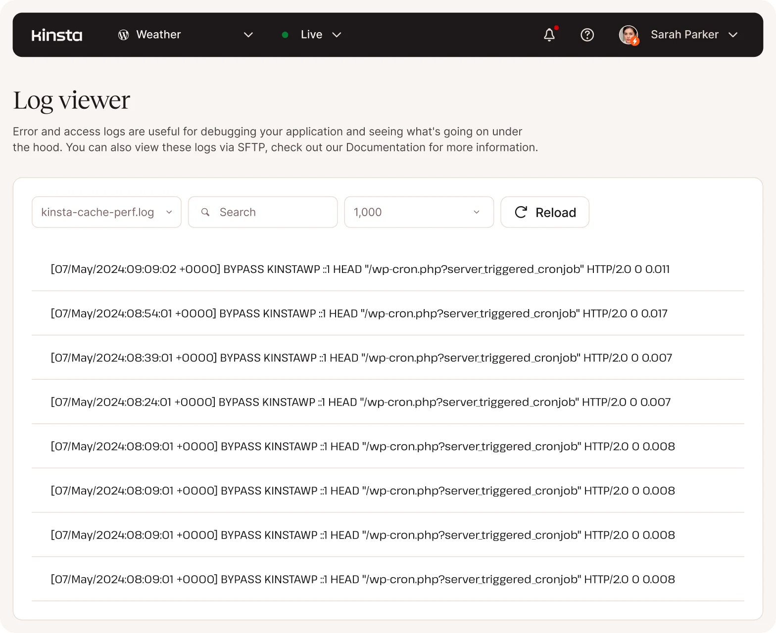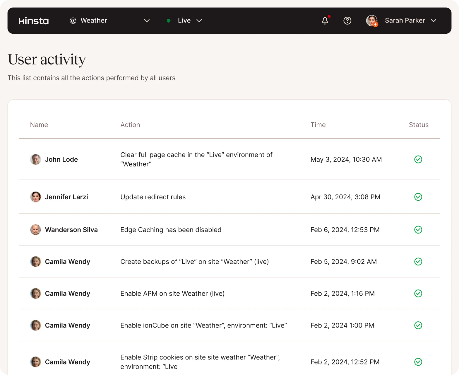 - Registros de atividade do usuário do MyKinsta