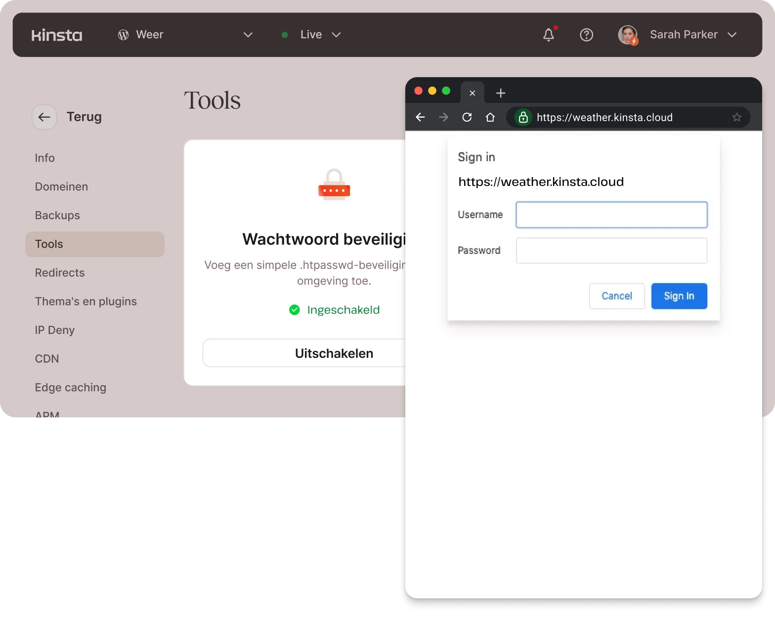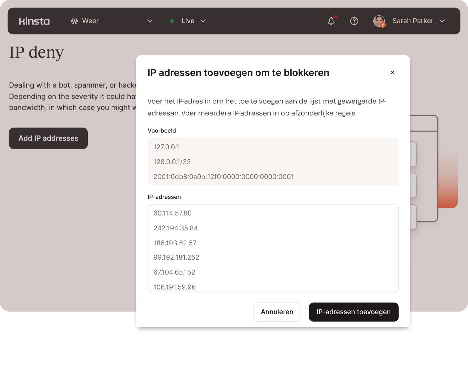 Alle sites zijn beveiligd achter Kinsta firewall, Cloudflare met Enterprise DDoS bescherming en Google Cloud firewall.