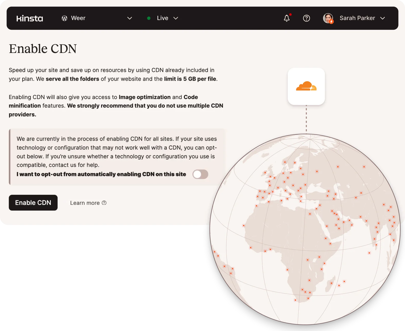 - Geïntegreerd CDN (Cloudflare) met WAF en enterprise DDoS-bescherming